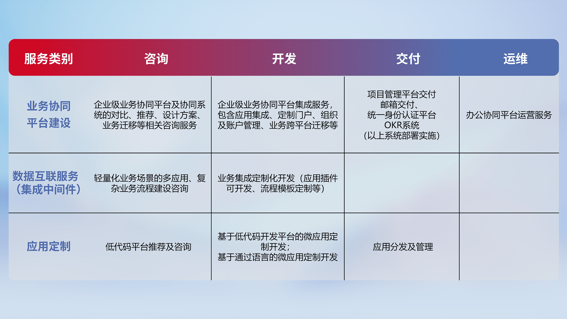 针对钉钉、、企微、、IDaas等平台级产品提供产品的规划、、方案、、交付、、、定制化开发等服务,,实现如统一协同办公、、、智能客户服务、、、混合会议管理、、、智能数据查询、、、等业务场景,,,实现数字化转型。。